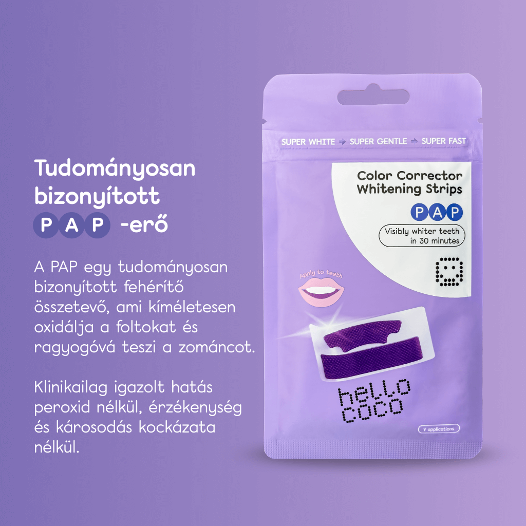 A hagyományos fehérítő csíkok peroxid alapú készítmények, amely fogérzékenységet okozhat. A Hello Coco PAP csíkok ehelyett PAP alapú, nem érzékenyítő formulát használnak.