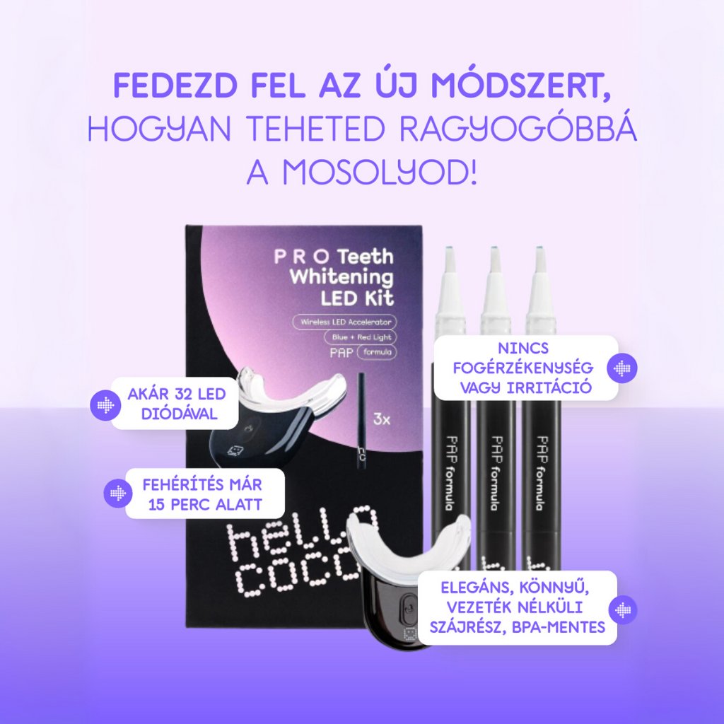 2 LED-es fogfehérítő készülék, amely kivételes eredményeket biztosít, mindezt kényelmesen. Könnyű, vezeték nélküli és vízálló kialakítás a maximális kényelem érdekében. A kék fény technológia oxigénnel látja el a PAP gélt, ezáltal aktiválja annak maximális fehérítő hatását. A piros fény csökkenti a fogak érzékenységét és egyben remineralizálja a fogzománcot.