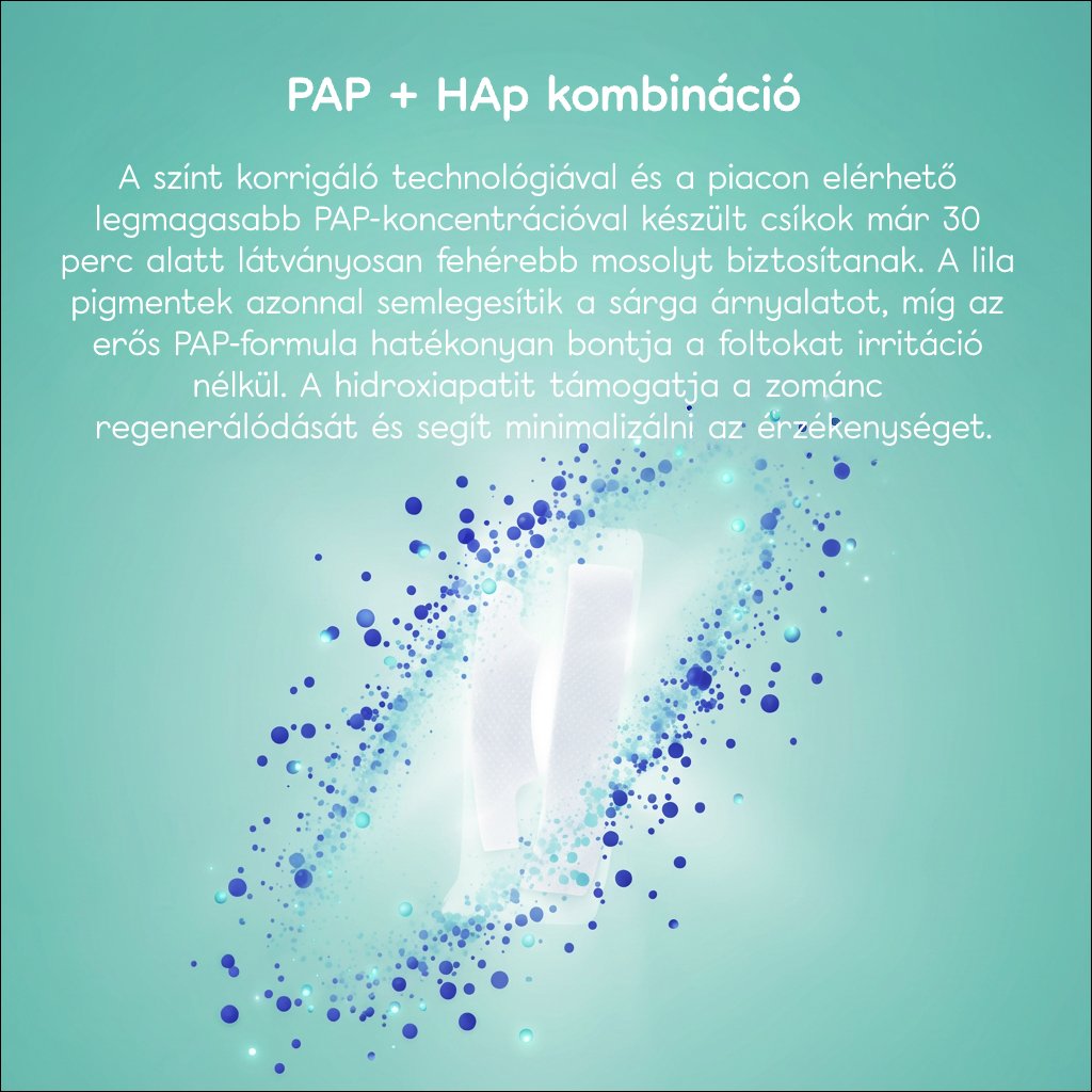 A csíkok egyszerűen és hatékonyan világosítják a fogakat otthonról. A klinikailag tesztelt PAP hatóanyag a fogzománc felszíni és mélyebb elszíneződéseit célozza, gyengéden oxidálva azokat.