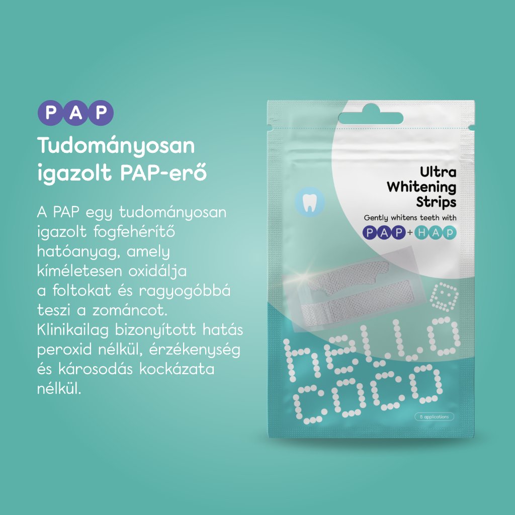 Hagyományos peroxid alapú csíkok gyakran okoznak fogérzékenységet. A Hello Coco csíkok PAP-alapúak, érzékenység nélkül, és hydroxyapatittal erősítik a zománcot.