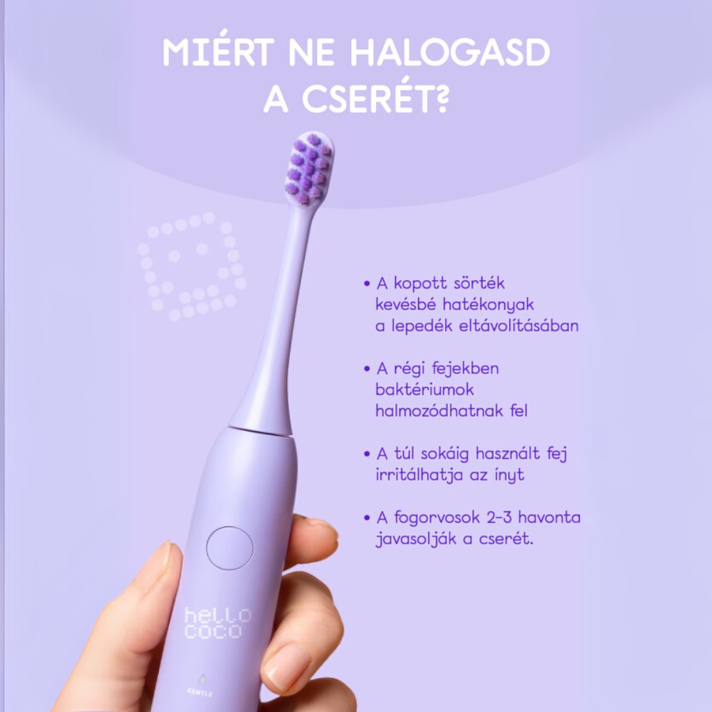 2 db kefefej, kifejezetten a hello coco elektromos szónikus fogkeféhez tervezve. Mindegyik cserefej kúp alakú, ultrafinom sörtékkel rendelkezik, amelyek garantálják a hatékony és alapos tisztítást.