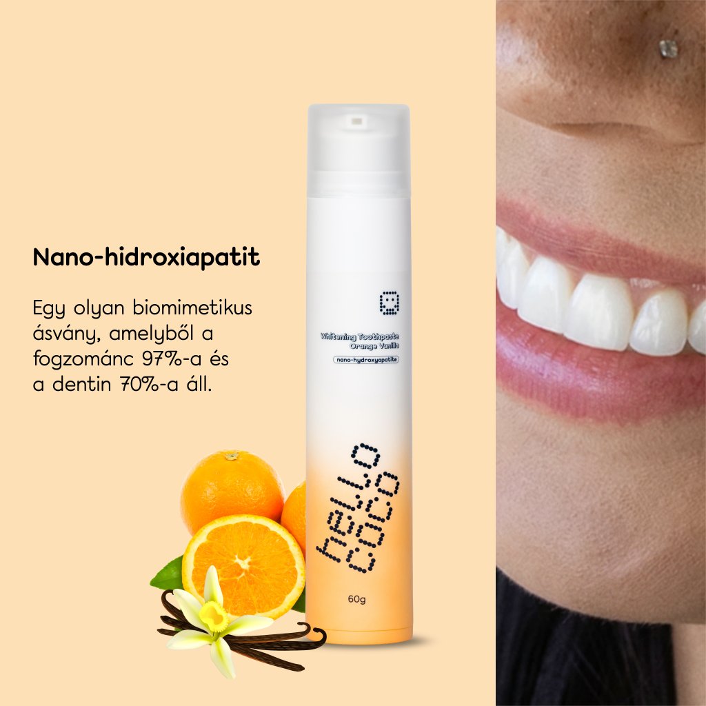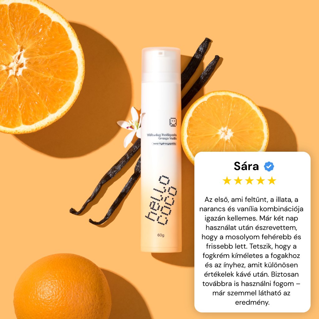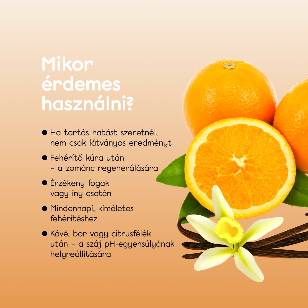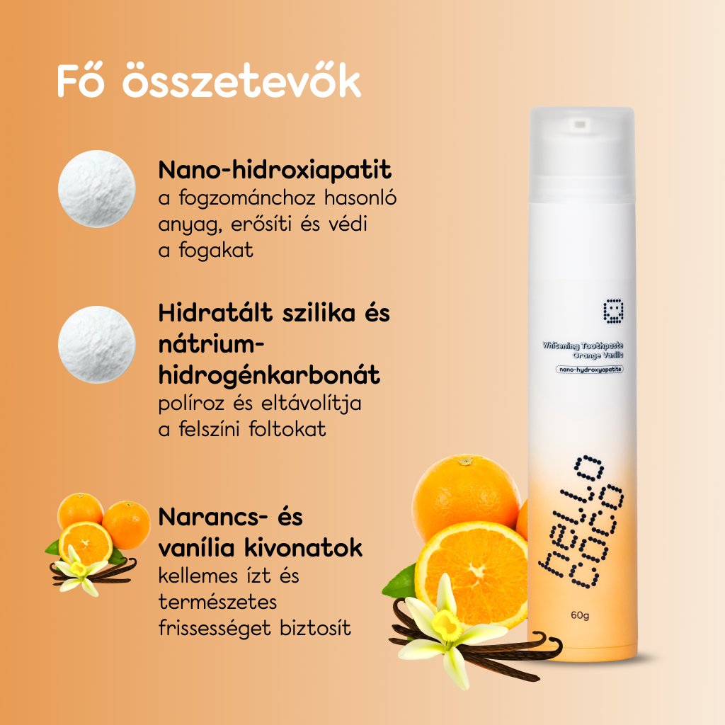 A szódabikarbóna eltávolítja a felszíni foltokat, a kókuszolaj fokozatosan világosít, miközben hidratálja a szájüreget és az ínyt, míg a nano-hidroxiapatit erősíti a fogakat és visszaállítja természetes fehérségüket. Érzékeny fogakra is remek választás! A frissítő narancs és vanília íz a lédús narancs friss jegyeit ötvözi a sima, krémes vaníliával a tökéletesen friss leheletért és a ragyogó mosolyért.