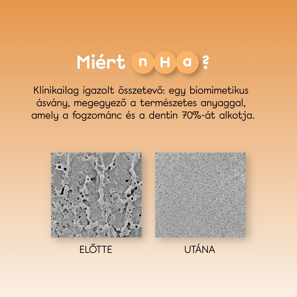 nano-hidroxiapatit (n-Ha), forradalmi előrelépés a fogászati ellátásban. A hidroxiapatit a fogak és a csontok fő alkotóeleme, amely segít a meggyengült zománc remineralizációjában és csökkenti a fogérzékenységet. Emellett simítja a fogak felszínét, így azok természetesen fehérebbnek tűnnek.