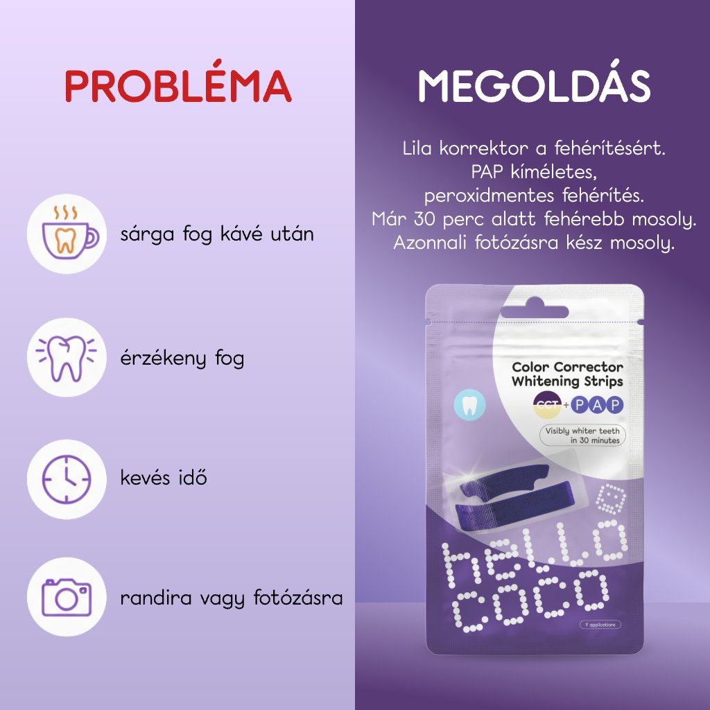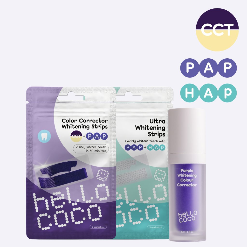 A PAP technológiás fehérítő csíkok látható fogfehérítést biztosítanak, a színkorrekciós fogkrém azonnal világosítja a mosolyt, míg a CCT csíkok az optikai hatást valódi fehérítéssel kombinálják. Az eredmény: hatékony, kíméletes és rendkívül kényelmes fogfehérítés.