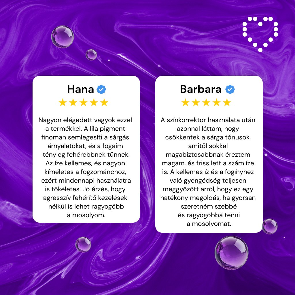 A korrektor paszta elősegíti a fogak fehérítését a színjavító technológia alkalmazásával. A fogakon lévő árnyalatok kiegyensúlyozásával a korrektor elrejti a sárga foltokat, javítva a fogak fehérségét.