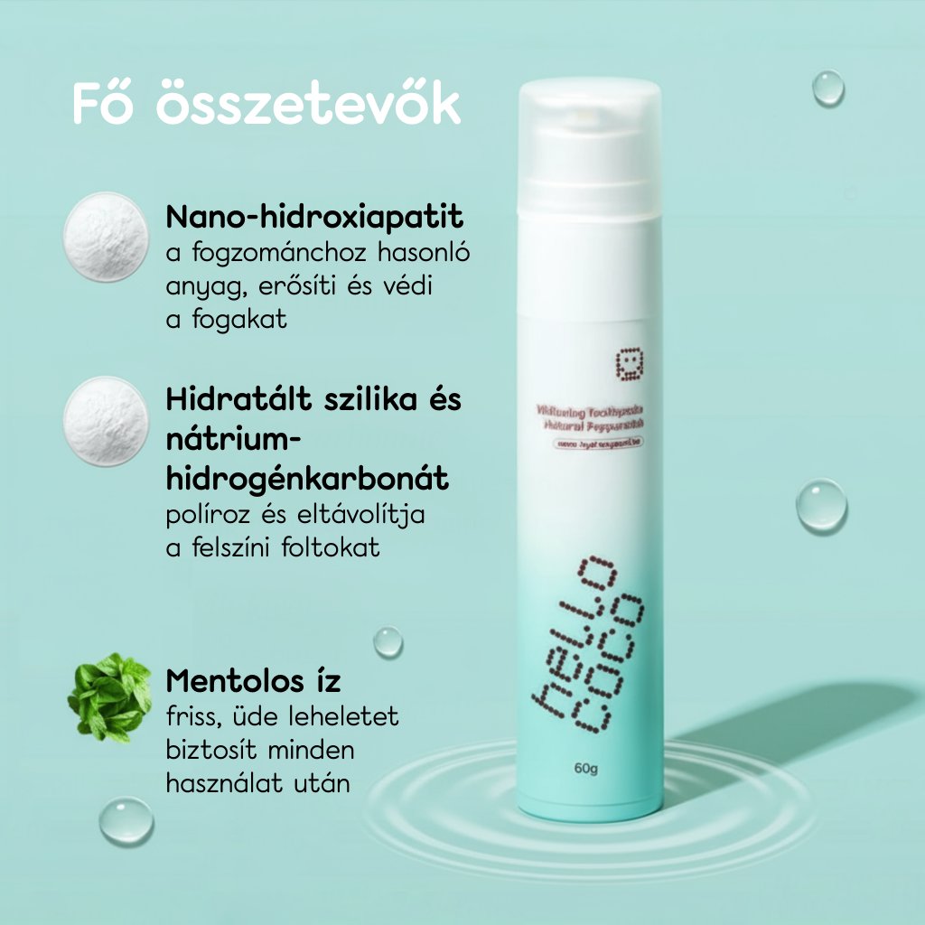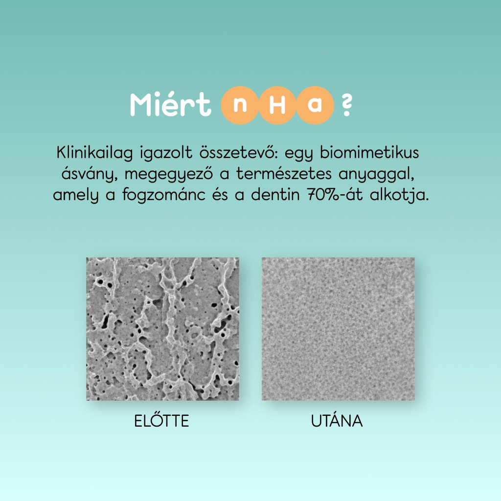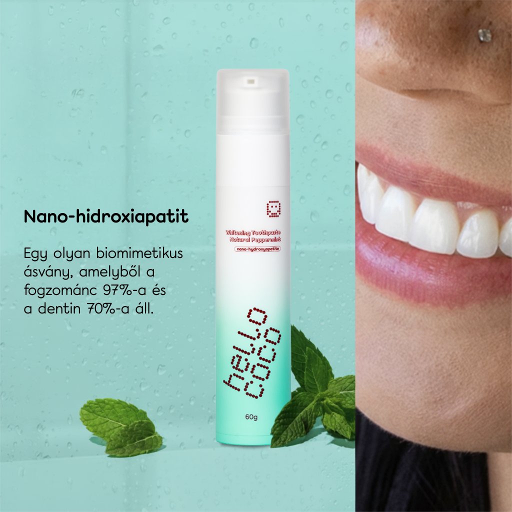 nano-hidroxiapatit (n-Ha), forradalmi előrelépés a fogászati ellátásban. A hidroxiapatit a fogak és a csontok fő alkotóeleme, amely segít a meggyengült zománc remineralizációjában és csökkenti a fogérzékenységet. Emellett simítja a fogak felszínét, így azok természetesen fehérebbnek tűnnek.