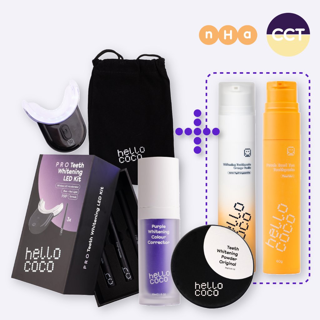 Professzionális LED-es fogfehérítő készlet + ajándék NHA Orange & vanilla és Őszibarackos teás fogkrém