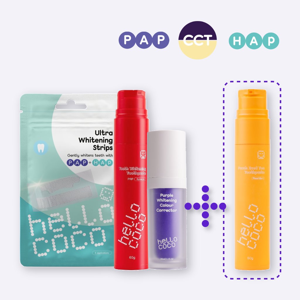 A színkorrekciós fogkrém világosítja a fogakat színkorrekciós technológiával, míg a legmagasabb PAP-koncentrációjú fehérítő csíkok ultra hatékony fehérítést biztosítanak. A mindennapos fehérítő fogkrém eltávolítja az enyhe elszíneződéseket és egységesen fehérebb mosolyt ad.