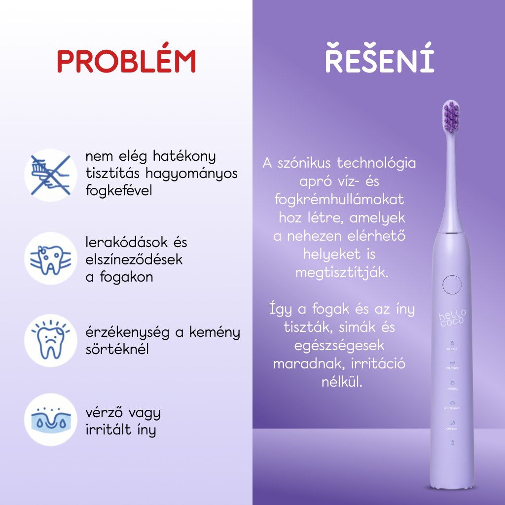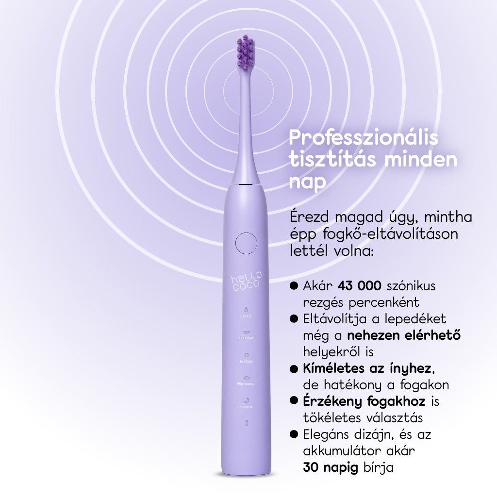 A hello coco elektromos fogkefe szónikus technológiát alkalmaz, amely a percenként akár 43.000 rezgéssel forradalmi szintre emelte a szájápolást. Hatékonyan, mégis kíméletesen távolítja el a szennyeződéseket és a felületi lepedéket, valamint segít megelőzni a fogkő kialakulását. A speciális üzemmódok személyre szabott tisztítási rutint biztosítanak, miközben minden módban gyengéden stimulálják és tisztítják az ínyeket.