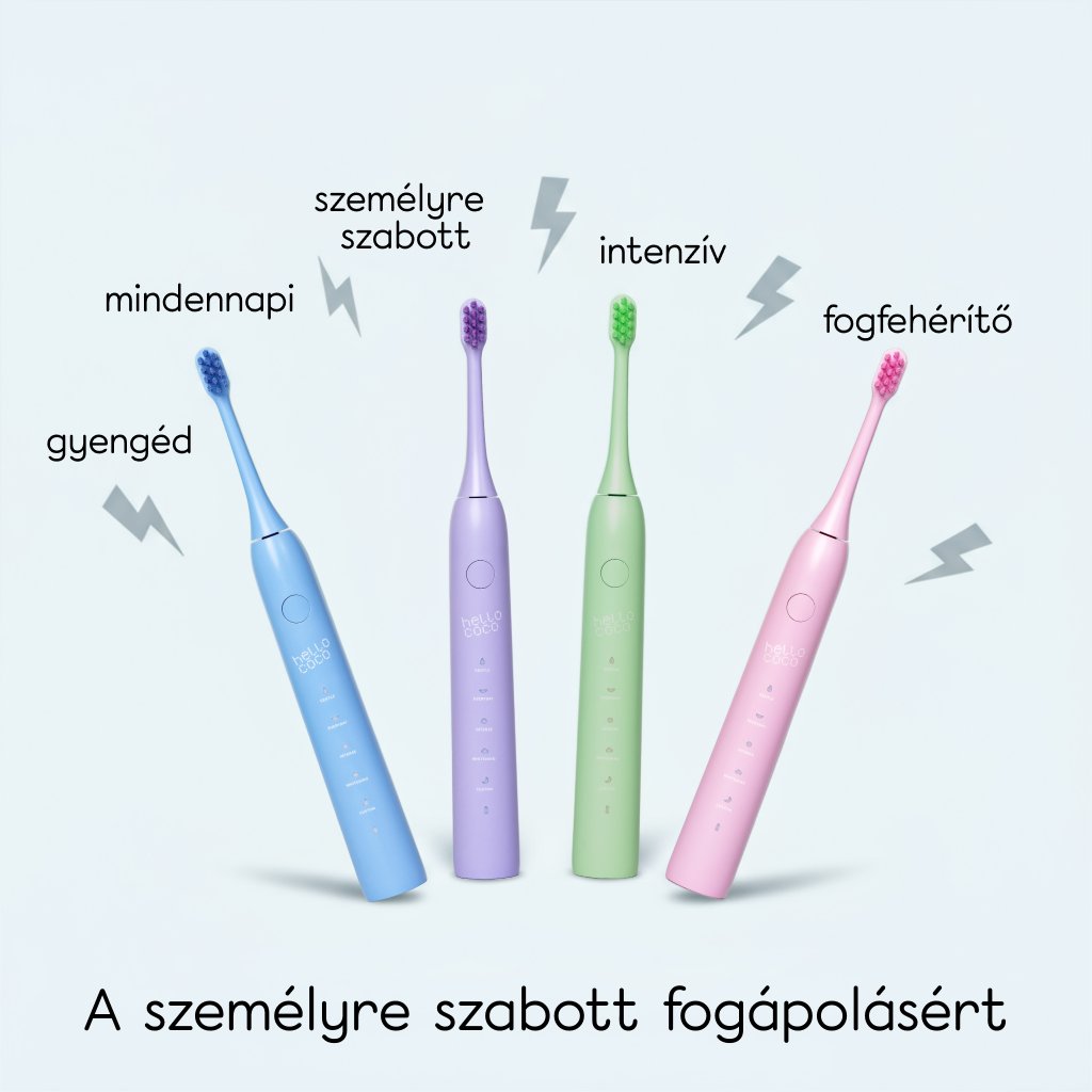 A hello coco elektromos fogkefe szónikus technológiát alkalmaz, amely a percenként akár 43.000 rezgéssel forradalmi szintre emelte a szájápolást. Hatékonyan, mégis kíméletesen távolítja el a szennyeződéseket és a felületi lepedéket, valamint segít megelőzni a fogkő kialakulását. A speciális üzemmódok személyre szabott tisztítási rutint biztosítanak, miközben minden módban gyengéden stimulálják és tisztítják az ínyeket.