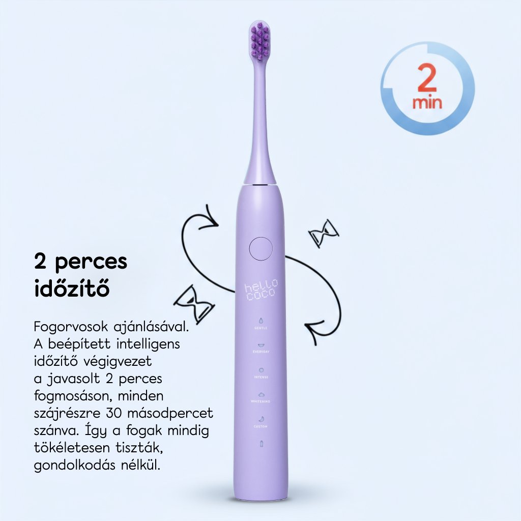 A hello coco elektromos fogkefe beépített időzítője 2 perc után automatikusan kikapcsolja a fogkefét. 30 másodpercenként hangjelzéssel figyelmeztet, hogy az egyenletes tisztítás érdekében a száj egy másik területére helyezd át a fogkefét.