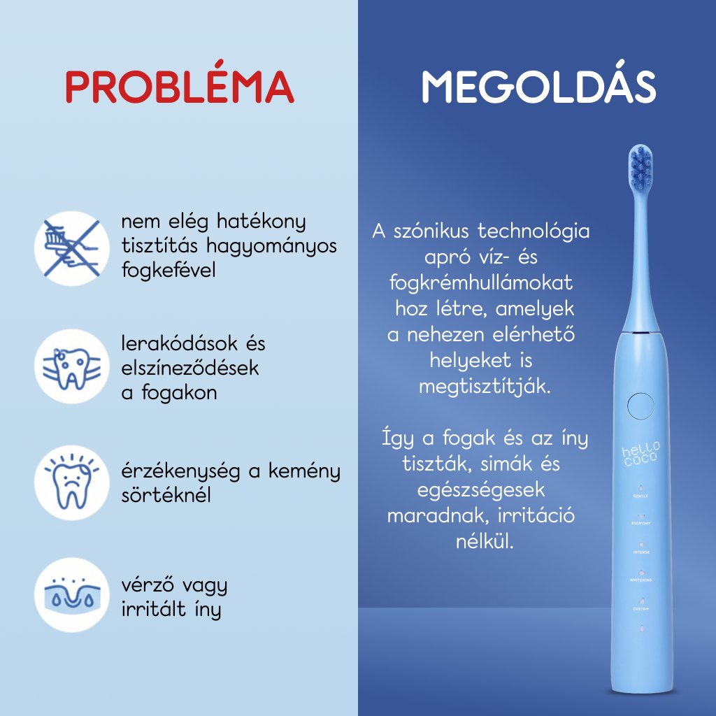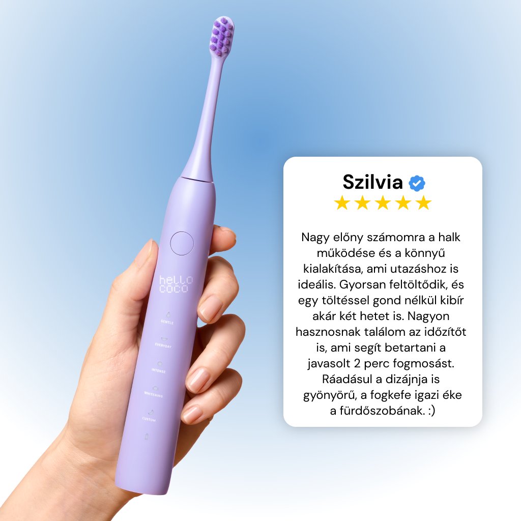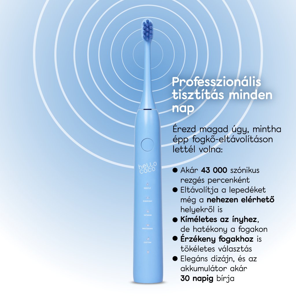 A hello coco elektromos fogkefe 120-szor erősebb, mint egy manuális fogkefe. Hatékonyabban távolítja el a lepedéket és a szennyeződéseket, alaposabban tisztítja a fogakat - mégis kevesebb időt és erőfeszítést vesz igénybe.