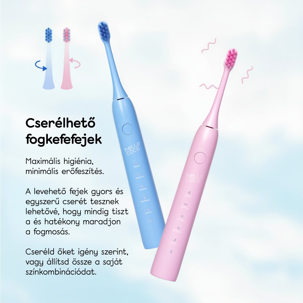 A hello coco elektromos fogkefe szónikus technológiát alkalmaz, amely a percenként akár 43.000 rezgéssel forradalmi szintre emelte a szájápolást. Hatékonyan, mégis kíméletesen távolítja el a szennyeződéseket és a felületi lepedéket, valamint segít megelőzni a fogkő kialakulását. A speciális üzemmódok személyre szabott tisztítási rutint biztosítanak, miközben minden módban gyengéden stimulálják és tisztítják az ínyeket.